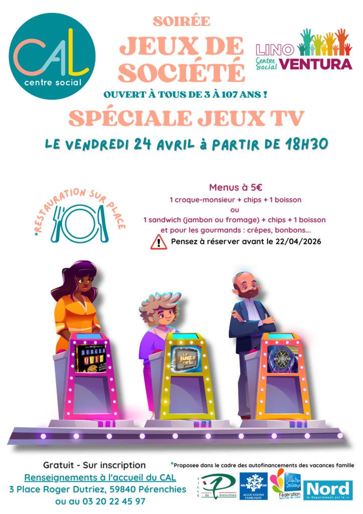 Le Centre Social CAL et le Centre Social Lino Ventura vous donnent rendez-vous pour une soirĂ©e pleine de fun et de dĂ©fis, inspirĂ©e des jeux tĂ©lĂ©visĂ©s ! đŸ“ș✹